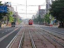 路面電車が走っています。待ちのメインストリートを走る電車は、レトロなタイプから新しい型までいろいろ。